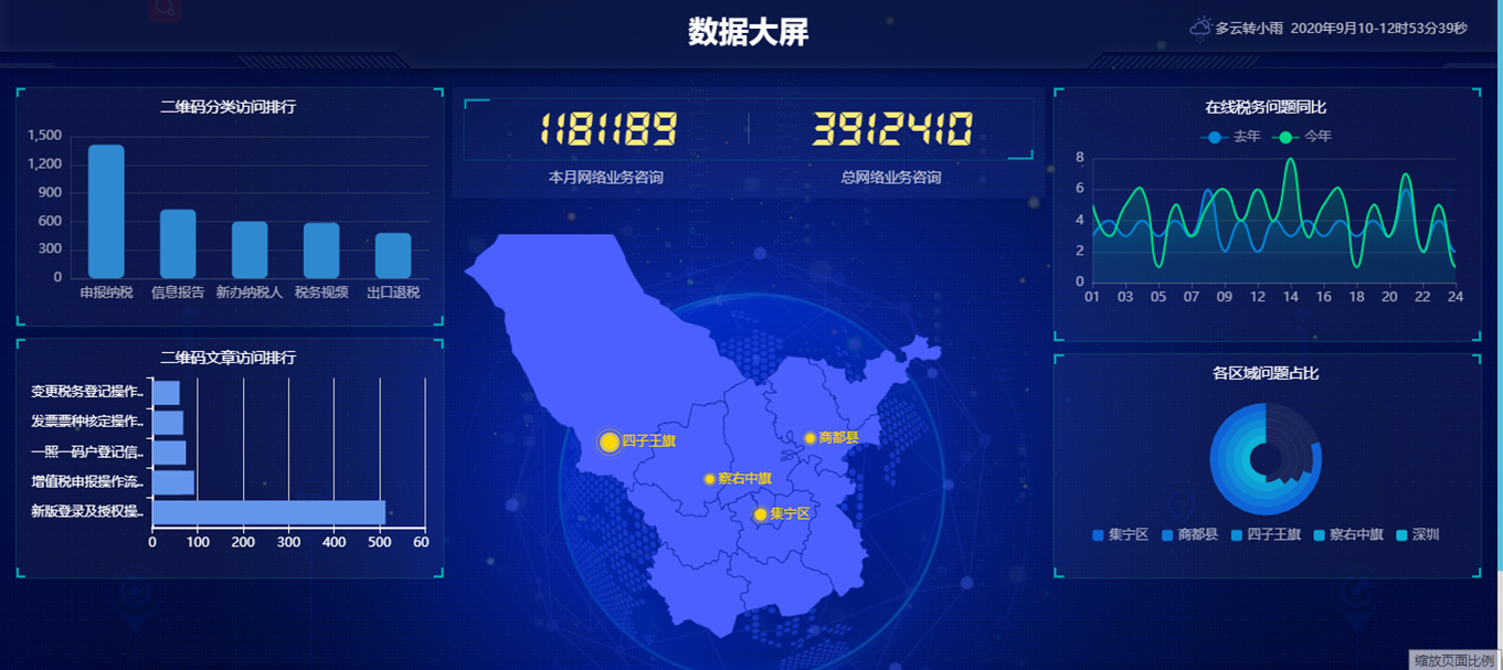 报表展示:平台支持通过饼图、趋势图、柱形图、网格图等方式展示报表。报表从不同维度展示服务情况,如:统计一定时期内某区域客户量、不同区域客户量对比统计、根据资源分类对比统计,如新办纳税人业务、社保缴费业务等。