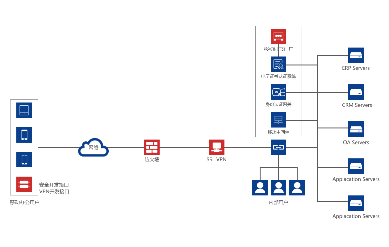 普及移动办公的前提,是解决移动办公所产生的网络安全问题。传统办公是使用电脑通过内网访问办公系统,而移动办公是使用各类移动终端通过公网访问办公系统,处于更加复杂的网络环境,面临的身份盗用、数据窃取的威胁更为严峻。因此,必须建设一套适用于移动办公的高强度认证和加密体系,用以保障移动办公的身份安全、数据安全。
