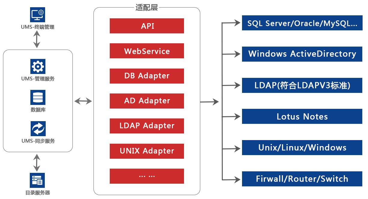 管理服务:是统一用户管理系统的核心组成部分,将所有应用系统的用户信息集中到统一用户管理系统进行管理,为管理员和用户提供统一视图