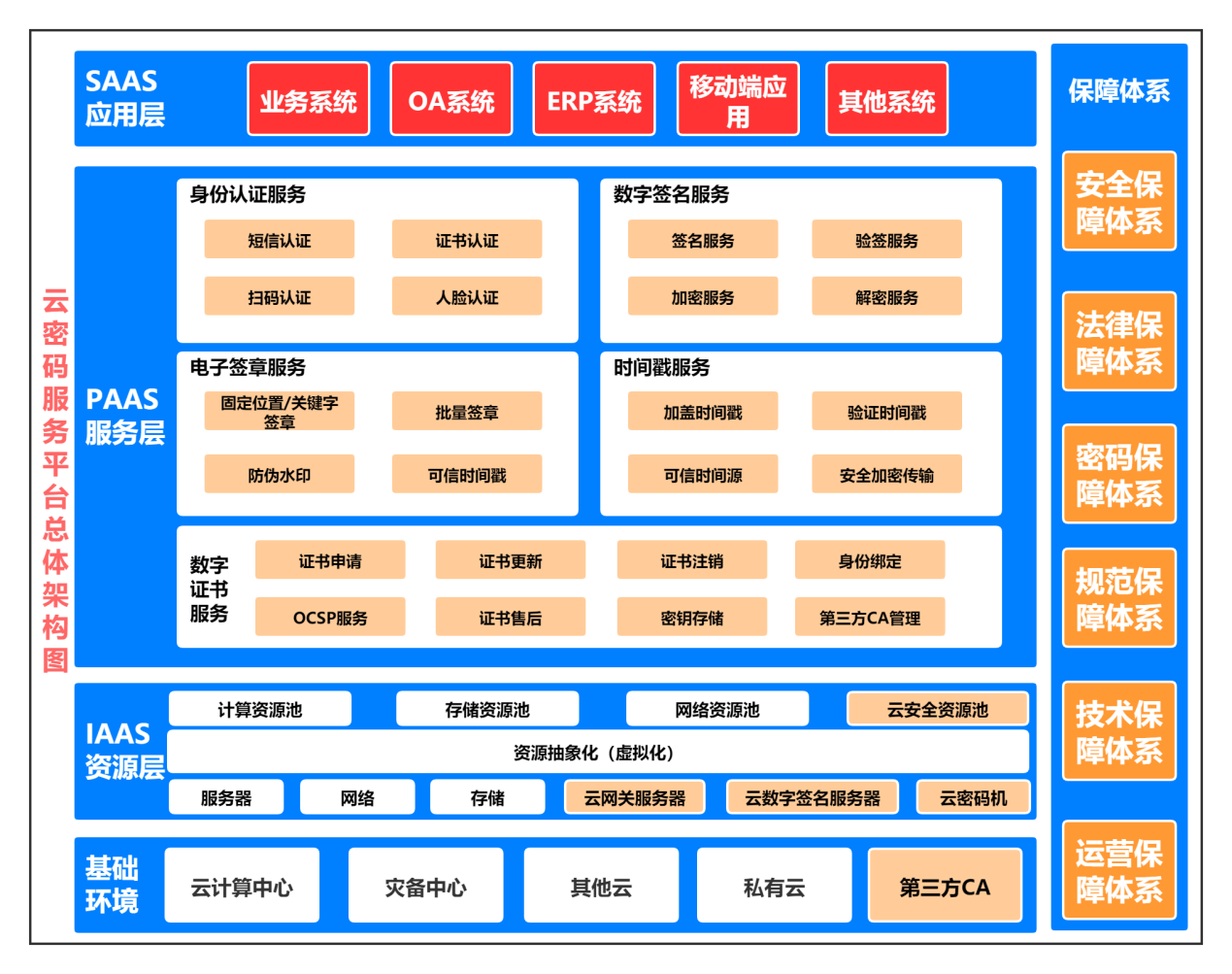 通用密码服务:根据云平台及云平台所承载的业务应用需要,以现有证书应用为基础,为用户按需提供弹性的签名验签、加解密、电子签章、时间认证等通用密码服务